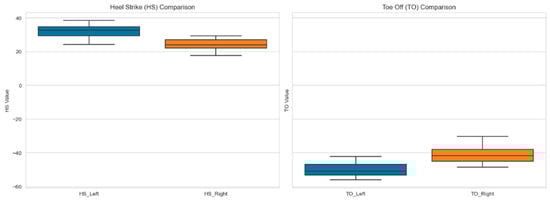 These visual comparisons allow us to observe that while there may be similarities in the distribution of gait parameters between the left and right feet, each foot exhibits unique characteristics. Figure 7 shows boxplots to compare the ranges and central tendencies of the HS and TO values. Figure 7 provides insights into the ranges, medians, and variability of these gait parameters for both feet. The boxplot of the HS values helps clarify how the Heel Strike phase might differ between the two feet in terms of intensity or position. Similarly, the boxplot of the TO values compares the distributions between the left and right feet, highlighting differences in the Toe-Off phase’s timing and intensity.