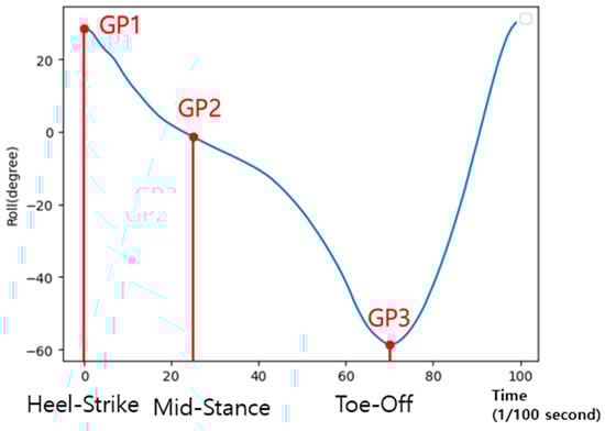 As shown in Figure 8, we can extract two points (GP1 and GP3) with the maximum and minimum values in the stance phase interval. In addition, we can identify the inflection point (GP2) in the interval (GP1, GP3). Gait feature points GP1, GP2, and GP3 can be associated with the points where Heel Strike, Mid-Stance, and Toe-Off occur in the gait segment. GP1 (Heel Strike) and GP3 (Toe-Off) are the points where the knee angle (roll value) shows its maximum and minimum values, respectively. The closed interval (GP1, GP3) corresponds to the start and end of the stance phase. Gait feature point GP2 is the point where inflection occurs and corresponds to Mid-Stance in the gait cycle. GP2 is also the point with the greatest variation between subjects. Table 3 shows the gait features extracted from the subjects.