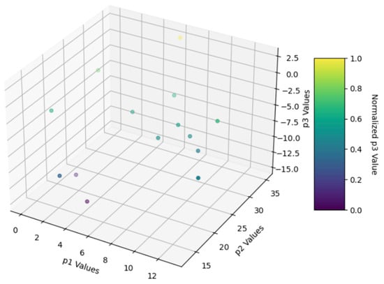 Figure 9 presents a 3D scatter plot showing the relationship between the values across GP1, GP2, and GP3 for each individual. In this visualization, the x, y, and z axes represent the GP1, GP2, and GP3 values, respectively, with the color intensity reflecting the normalized GP3 values.