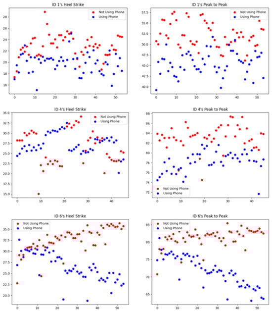 Walking begins at the heel strike (HS) stage, the moment the heel touches the ground. At this time, the foot is placed on the ground and the leg starts to move. The toe-off (TO) stage is the moment when the sole of the foot is lifted off the ground, preparing for the next gait cycle. Among the subject’s gait parameters, the HS and the TO values were visualized as a scatter plot in Figure 10. In Figure 10, the HS and the TO values when a mobile phone was not used and when used are indicated by red and blue circles, respectively. The TO average was higher in the case of not using a mobile phone than in the case of using a mobile phone. There is a clear difference in the scatter plot, enough to distinguish whether or not a mobile phone was used for most of the subjects (5 out of 7).