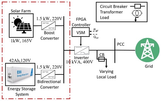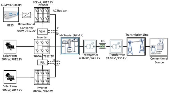 The grid-connected PV-BESS microgrid network consists of two three-phase central inverters for solar PV and energy storage systems. The PV inverter can deliver 100 MW of maximum power at a temperature of 25 °C and irradiance of 1000 W/m2, and the BESS consists of a battery unit with 60 MWh capacity. The PV inverters are connected to a medium-voltage power network through a 4 kV/24.9 kV distribution transformer. The single-line diagram of the test system is shown in Figure 8. The PV array is forced to operate at its maximum power point by regulating the dc link voltage to its reference value.