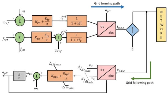 The GFL-based inverter control works in current control mode and has an outer synchronization loop and an inner control loop. The GFL converter works according to the reference values of the grid and tracks the phase angle of the voltages at the PCC and adopts a vector control strategy to adjust the active and reactive currents that are injected into the power grid. The GFM inverter control works in voltage control mode to produce the reference frequency and voltage of the grid. The requirement of GFM-based control is highly required whenever the network is disturbed due to faults or in an islanded mode of operation during which GFM control regulates the voltage and frequency, increasing grid strength, and maintains stable operation even under high IBR penetration. The structural overview the GFL- and GFM-based inverter control in the microgrid is depicted in Figure 2.
