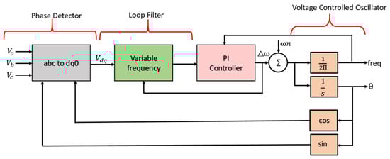 The synchronization of the grid is maintained by regulating the terminal voltage of the PV inverter such that it matches the phase voltage, amplitude and frequency as defined by IEEE 1547-2018 [7]. In this work, two methods of PLLs are used for synchronization: a phase-locked loop for obtaining the phase voltage at the PCC and power balance synchronization, to regulate the frequency as shown in Figure 7. The phase detector block will output a signal that is proportional to the phase difference between the reference voltage and voltage generated by the internal oscillator of the PLL. The loop filter block is usually made up of a first-order low-pass filter or PI controller which will attenuate the high-frequency components of the signal output of the previous block. The voltage-controlled oscillator generates an AC signal whose phase is compared with the input signal of the phase detector block, and the phases are matched by adjustments made to the oscillator.
