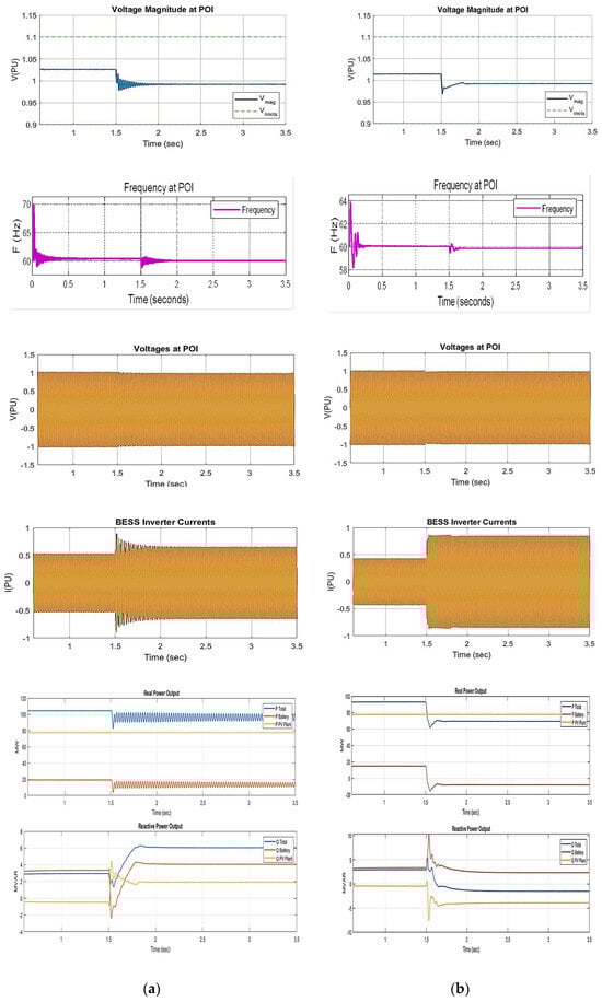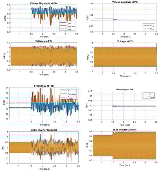In this case, a three-phase fault is created on the grid side at 1.5 s, and the response of the BESS with a GFM inverter during a grid outage in an islanded mode of operation is shown in Figure 12. From the simulation analysis, it is observed that the BESS with GFM control is able to deliver the required power to satisfy the medium voltage load in an islanded mode with a very fast response of 60 ms, with voltage and frequency within the acceptable limits recommended by IEEE standards. During system faults, the system parameters settle down in a shorter period for the GFM-based inverter control than the GFL control, and switching transients are much reduced in the GFM-based control system. In an islanded mode, as the BESS is connected, it provides good frequency regulation for the microgrid network. When there is a grid outage, we can observe that the BESS with GFM control can proceed to deliver the power needed by the load and run the network in an island mode with acceptable system voltage and frequency. Table 4 provides the system parameters during grid outages, and we can observe that the voltage at PCC is 1.02 per unit, and the frequency is 59.8 Hz. Table 4 depicts the performance of the coordinated GFM- and GFL-based inverter control for an islanded mode of operation due to grid outages. As the GFM-based inverter control can generate voltage and frequency without a grid in islanded operation, it is the most suitable control method for weak grid networks.