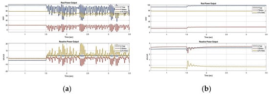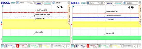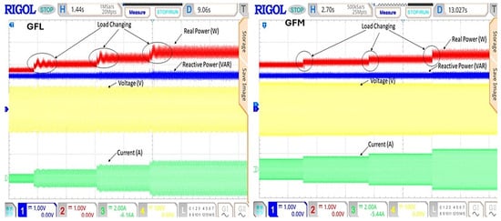 The integrated GFL- and GFM-based inverter controls were implemented in FPGA-based controller boards in a real-time microgrid setup. When the network is switched to islanded operational mode in which the local renewable generations and load are available, the renewable-fed inverter is operated in grid-forming control by which voltage and frequency are regulated. The hardware setup was tested under islanded operation by disconnecting the grid and retaining only solar PV, BESS and local load. The system was analyzed under two cases, namely varying irradiance conditions and varying irradiance and load conditions, and the experimental results are provided in Figure 18 and Figure 19, respectively. Table 8 depicts the performance of the system under GFM- and GFL-based inverter controls. The performance of the system clearly demonstrates that more oscillations and a longer settling time are observed in the GFL inverter control when compared with GFM inverter control. GFM-based inverter control provides a fast system response when subjected to varying irradiance and loading conditions.