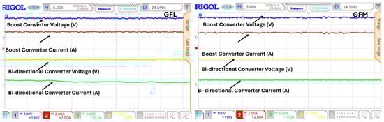 When the microgrid comprising solar PV and battery systems is operated in grid-connected mode, the generated power from renewables and storage systems is fed into the grid. Figure 16 displays the experimental results of GFL and GFM control under grid-connected operation. When the system is subjected to varying solar irradiance conditions and is implemented with the proposed control models, it is found that GFM has minimum switching transients when compared to GFL control during grid-connected operation. The real power and reactive power have fewer oscillations in GFM than in GFL control. The real and reactive power injected into the grid is more stabilized in GFM-based control when integrated with the grid. Figure 17 displays the performance of boost and bidirectional converters of the solar PV system and BESS in a microgrid network. Table 7 provides the performance of the microgrid experimental setup in grid-connected operation. As the GFM-based inverter control does not require stiff and stable voltage at the PCC, the microgrid network with GFM-based inverter control can exhibit more real power penetration than the conventional GFL inverter control. It is understood from the experimental results that GFM control can provide a faster response than GFL control as GFM control can stabilize the grid conditions instantaneously.