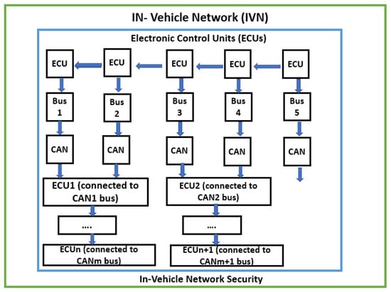 Several feature engineering techniques have been proposed for IVN anomaly detection, including wavelet transform [5] and principal component analysis (PCA) [6]. In general, IVNs are becoming increasingly complex and interconnected, making them vulnerable to cyber-attacks. Anomaly detection is a crucial tool for identifying potential threats and preventing cyber-attacks in IVNs. Machine learning-based anomaly detection techniques offer a promising solution to this problem by leveraging the power of machine learning to learn complex patterns and relationships in the data. The key challenge in using machine learning for anomaly detection in IVNs is the need to extract relevant features from the raw data. The IVNs architecture is shown in Figure 1