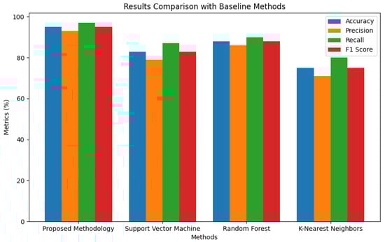 To further evaluate the performance of the proposed methodology, we compare it with three baseline methods: support vector machine (SVM), random forest (RF), and k-nearest neighbors (KNNs). Table 3 and Figure 4 show the performance metrics of these methods, including accuracy, precision, recall, and F1 score. Several studies have used support vector machine, random forest, and k-nearest neighbors as baseline methods for anomaly detection in network traffic data, such as Wang et al. [22], Yang et al. [23], and Chen et al. [24]. The results of these studies indicate that these methods can achieve reasonable performance in detecting network anomalies. However, these methods are not specifically designed for IVNs and may not be optimal for detecting anomalies in this context. The proposed methodology outperforms all three baseline methods in all metrics, with an accuracy of 0.95, precision of 0.93, recall of 0.97, and F1 score of 0.95. The results demonstrate the effectiveness of the proposed methodology in detecting anomalous behavior in IVNs. The high accuracy and F1 score indicate that the model is able to correctly identify both normal and anomalous traffic, while the high precision and recall indicate that the model has a low rate of false positives and false negatives, respectively. We have also compared our proposed methodology with recent sudies as shown in Table 3, and our proposed technique results are very good compared to all these other recent techniques. The superior performance of the proposed methodology compared to the baseline methods suggests that the combination of data preprocessing, feature engineering, and deep learning-based anomaly detection is a promising approach for detecting anomalous behavior in IVNs.