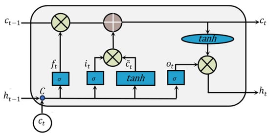 where C is intermediate state, which is concatenated by the hidden state of the previous time step, and the new state information, . is the cell state of the previous time step. , , , are the weights corresponding to the cell states of the oblivion gate, the input gate, the output gate, and the output. , , , and are the biases. and tanh represent the sigmoid activation function and tangent activation function, respectively. is a dot-multiplication operation between the matrices.
