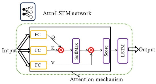 The attention mechanism helps the LSTM encode the key information of the input state in the environment into the hidden state to provide global context information, which is input to the LSTM network to extract the time-domain features among the data, ensuring that the LSTM network will not change over time during long-term training and lose key information. In Figure 1, the internal structure of the LSTM network includes a forgetting gate, input gate, and output gate. The input gate is used to control the LSTM structure to receive the output data from the port of the attention mechanism. The input information of the LSTM, is the information that is processed by the attention mechanism. The structure of the LSTM is shown in the figure. The following equations represent the internal rules about the output results of the LSTM in the Attn-LSTM structure: