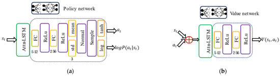 The structures of (a) the strategy network and (b) the value network. Both the value network and the strategy network are composed of an Attn-LSTM structure and MLP (multilayer perceptron).