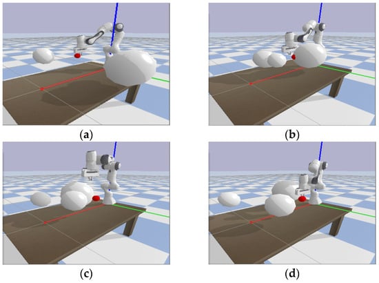 Simulation in the environment. (a) The manipulator reaches the target point on the left side of the obstacle; (b) the obstacle gradually approaches the manipulator; (c) the manipulator avoids the moving obstacle; (d) the manipulator reaches the target point on the right side.