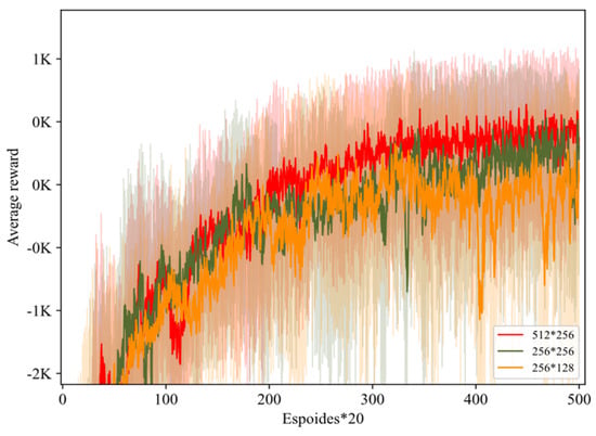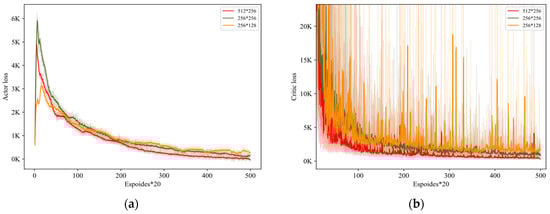 The SAC algorithm has a large number of hyperparameters and affects the effectiveness of the algorithm training. We referred to other articles in the same field on hyperparameter settings [,,,,] and gave the determinable hyperparameter settings shown in Table 1 below. The hyperparameter explored was the effect of the number of hidden layers on the performance of the algorithm. We discuss this in three cases, 512 × 256, 256 × 256, and 256 × 256. We implemented 10,000 episodes of training in the environment and recorded the loss values of the actor network and the critic network, as shown in Figure 6a,b. Also, the sliding average was recorded every 20 episodes. In Figure 6a, it can be seen that the loss curve of the 512 × 256 hidden layer structure has a smoother curve relative to the other two, while the loss value decreased faster, and the actor network had a better strategy for selecting actions. And Figure 6b shows that the Q-value network of the 512 × 256 structure converged to a relatively stable state, learning a better estimation of the value function, with no large oscillations during the training process. The average rewards corresponding to the three different hidden layer structures are shown in Figure 6, and it can be seen that the 512 × 256 structure represented by the red color had the largest reward value at convergence. Combined with the reward value in Figure 7 and the loss curve in Figure 6, it can be seen that the SAC algorithm with the 512 × 256 structure converged faster and had the best overall algorithm performance. Therefore, the SAC algorithm we used adopted the 512 × 256 hidden layer structure.
