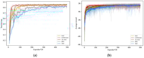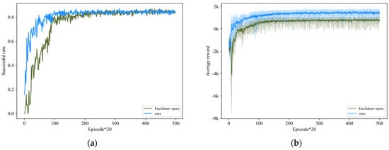 It can be seen in Figure 8a and Figure 9a that our reward function had a high convergence speed and success rate. Compared to the SAC algorithm, which used the contrastive reward function, calculated in terms of running episodes, the convergence states were reached by 480 episodes and 2600 episodes earlier, respectively. After completing exploration and starting to converge, the success rates increased by 1% and 7.4%, respectively.