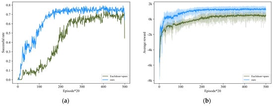 Comparison of ‘Euclidean + spare’ and our reward function in Env1. (a) Average success rate; (b) average reward.