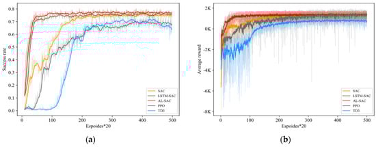 In order to verify the effectiveness of the proposed method, we expanded the experiment into two parts, namely verification of the improved reward function and effectiveness analysis of the SAC algorithm (AL-SAC) based on the Attn-LSTM network. In the first set of experiments, the SAC algorithm used the same code and the same network structure, including the activation function ReLu, the optimizer Adam, a learning rate, batch size, experience pool, discount cost, and other hyperparameters. The ‘Euclidean+ sparse’ reward function and the improved reward function were used for manipulator motion planning. After 10,000 episodes of algorithm training, the average success rate and reward value were compared.