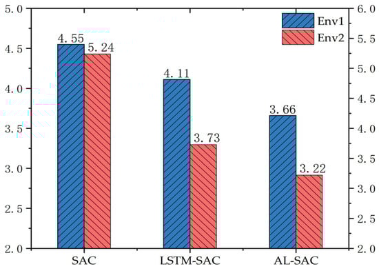 In the second set of experiments, we used the improved reward function as the baseline to comparatively analyze the performance of the SAC algorithm, the LSTM-based SAC algorithm (LSTM-SAC), and the Attn-LSTM-based algorithm (AL-SAC). The performance indicators evaluated included the average reward value, average reward, and total collision probability. Both sets of experiments set up two environments with different difficulties. The distance thresholds from the end effector of the manipulator to the target point in Environment 1 (Env1) and Environment 2 (Env2) were 0.1 and 0.05. The third set of experiments, based on the above experiments, analyzed the real-time distance from the manipulator to the obstacles and target points.