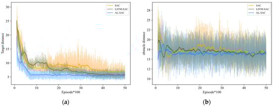 In order to more intuitively observe the movement status of the robotic arm in a complex environment, the test was conducted in Environment 2, which had a more difficult task. Figure 13 shows the graph of the distance between the end manipulator of the robotic arm and the target point and the shortest distance to the obstacle after 5000 rounds of training of the robotic arm. The shaded part is the recorded value of 5000 episodes, and the curve indicates the average value recorded every 100 episodes. Each distance record value represents the superposition value of the maximum 100 running steps in the environment under one episode. It can be seen in Figure 13a that the curve change slope of the AL−SAC algorithm is larger, indicating that it had a faster convergence speed, and it began to converge and reached a stable state at 800 episodes. Curve in Figure 13b shows that in the same episodes of the AL−SAC algorithm, the distance between the manipulator and the obstacle remained in a stable state, and the distance was shorter than the other two algorithms. Combined with the analysis of Experiment 2 above, this shows that the introduction of the Attn−LSTM structure into the SAC algorithm can extract more important information during the training process, accelerate the convergence speed of the agent, and improve the success rate. At the same time, the stability of algorithm performance is increased.