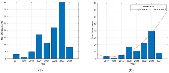 Number of literature contributions for the use of AI applied to ESSs for EVs: (a) absolute numbers per year in the 2017–2024 period and (b) trend line for the growth of the topic analyzed.