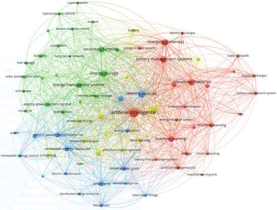 Co-occurrences for the implementation of AI to ESSs for EVs (VOSviewer).
