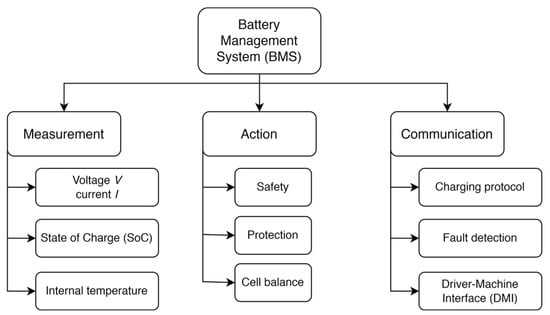 The use of AI for vehicular subsystems to help manage the energy stored is progressively spreading towards an intensive application []. Figure 4 collects the main tasks deployed by BMSs universally. A BMS performs measurements through sensors—in particular, it derives the measurement of battery SoC—and then acts on the system in order to ensure its correct working conditions and safety and realize data communication to transmit relevant information to drivers. Different BMSs can be recognized []: