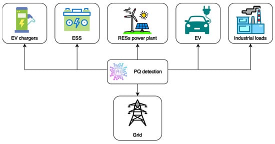 The Power Quality (PQ) issue has emerged in the last decades due to the diffusion of electronic power devices and their interactions with the electricity distribution network [,]. As an emerging topic, few contributions to the literature were retrieved. Given their non-linear behavior and the harmonic distortion generated in power grids, the integration of such components must be treated well, especially in the development of smart grids (or microgrids), where the cooperation between EV charging infrastructure, users’ loads, RES generation, and ESSs is realized, as Figure 5 depicts []. Focusing on PQ is needed to ensure the reliability and safety of the network, stabilize the energy flow, and reduce the detrimental effect of harmonic distortion injected into the grid. The fundamental role of AI here is harmonizing the cooperation between different electric loads—each featured by different generation dynamics and daily load profile—acting on the same distribution grid. PQ issues can be mitigated through passive filtering in the network, but it is necessary to quickly detect the nature of the imbalance-generating downgrades on the power quality transferred []. Here, a comparison between the AI approach and Fuzzy Logic Control is performed, with very close final results [,]. The potentiality of AI is limited by the training phase, which must be accounted for to increase its accuracy. The need for AI in this field relies mainly on performing optimization processes, data analytics, and asset management, organized into three levels as follows []: