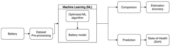 Dynamic EV battery health prediction with AI employs advanced algorithms for real-time analysis and modeling of degradation patterns []. This approach supports charging optimization, enhancing battery life and overall efficiency. Prognostics in battery health focuses on anticipating future degradation in energy or power, aiming to predict when the performance of the battery will no longer meet satisfactory standards []. The constraint is to have a pre-processing phase of the dataset coming from the battery, i.e., adapted to the purposes of the ML process []. This operation is oriented to optimize the algorithm aiming to constitute an ML-based battery model, which can be exploited either to benchmark estimation accuracy among different approaches or predict the battery SoH based on available operative data in a straightforward way. The ML modeling process described is illustrated in Figure 7.