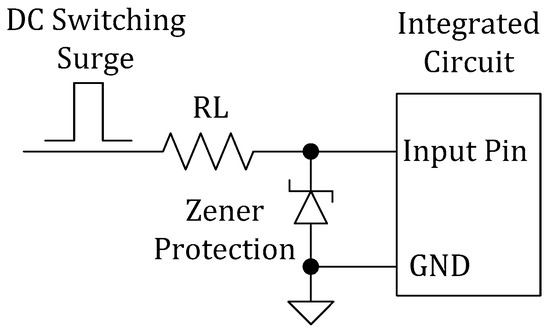 Zener diodes have been used extensively in a wide variety of voltage reference and protection applications since they were first introduced in 1934 by Clarence Zener. Typically, a Zener diode contains an extra doped region that is varied to change the Zener reference voltage clamp level [1]. The Zener quantum tunneling effect demonstrates the unique operating function distinguishing it from other types of diodes. Zener diodes are also used to clamp surges to an acceptable voltage level, therefore, some form of degradation will occur. This degradation can change the performance of the Zener diode due to the channeling of surge energy away from the protected circuit and dissipation in the form of heat. Previous studies have attempted to characterize Zener diodes in terms of reliability, focusing on 1/f noise [2,3], breakdown voltage mismatch [4], pulsed electrical overstress [5], functional data analysis [6], physical failure analysis [7], and technology computer aided design (TCAD) [8]. In some of these studies, non-destructive methods were used, and in other studies, computer aided designs were used. Although these methods provided great insight into how these diodes work, performance analyses of Zener diodes subjected to occasional DC switching surges with a gradually increasing surge voltage are still lacking, according to the authors. Experimental DC switching surge degradation analysis has been shown to be a reliable method to determine the durability performance of metal oxide varistors (MOV) [9]. The aim of this study was to find a novel experimental approach to determine the actual current–voltage characteristics of a Zener diode under this type of DC switching surge degradation. The actual Zener diode reliability will be measured not only to compare with other published reliability performance methods. According to the authors, this study distinguishes itself from other studies because it is an experimental approach to characterizing the reliability of Zener diodes subjected to DC switching surge degradation. Zener diodes are commonly used to protect integrated circuit (IC) pins from occasional DC switching surges, as illustrated in Figure 1.