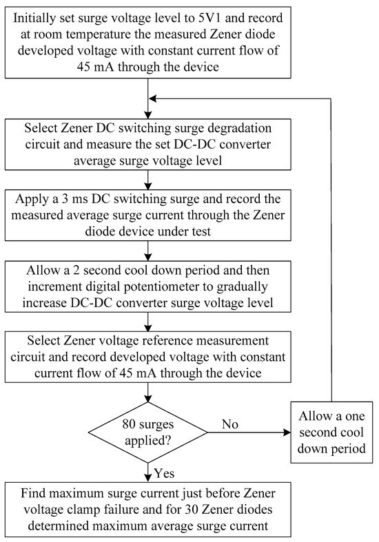 The same proposed experimental setup was used to comparatively analyze the reliability of all three manufacturer selected Zener diodes against DC switching surges and therefore, the measurement consistency in this study was more important than the absolute accuracy. The algorithmic flowchart for the proposed experimental approach is illustrated in Figure 2. This flowchart outlines the steps to determine the maximum average surge current level that a Zener diode can withstand when subjected to a gradually increasing DC switching surge voltage amplitude.