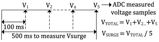 The surge voltage level of the DC–DC converter controlled by a digital potentiometer was scaled down using a voltage divider network for measurement by the microcontroller’s analog-to-digital converter (ADC). Two 10 K resisters, each with a 1% tolerance, were used to divide a maximum 10 V voltage setting down to an acceptable microcontroller 5 V ADC input level. The ADC had a 10-bit resolution with a ±2 LSB absolute accuracy. Therefore, a 5 V input divided by 2 to the power of 10 is 4.88 mV per bit change, and a +2 LSB error would be 9.76 mV. The maximum surge voltage setting reached after 80 incremental digital potentiometer steps was 8.1 V. Therefore, the maximum potential error would be 9.76 mV divided by 8.1 V, which is 0.12%. With voltage divider resistors of 1% tolerance, the DC–DC surge voltage level measurement can be considered accurate because the error will not be more than 0.2%. In addition, to improve the measurement consistency, the ADC took five evenly spaced voltage samples 100 ms apart. The average surge voltage applied to the Zener diode was then calculated by averaging these five samples, as illustrated in Figure 3.