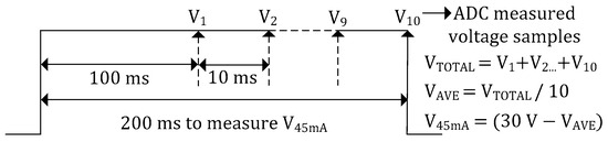 A precise 30 V linear DC power supply was switched across the Zener diode under test in series with a calibrated 45 mA CCS circuit by means of a fast solid-state electronic switch. Using an accurate 6 and 1/2-digit precision multimeter, a trim pot was used to calibrate a TLV431 device to ensure a 45 mA CCS. To prevent any circuit loading, a buffer circuit was employed to measure the average voltage developed across the CCS circuit. This average measured voltage was subtracted from the applied precise 30 V linear DC power supply to determine the actual voltage reference developed across the Zener diode under test. To improve the measurement consistency, after the 45 mA constant current flowed through the Zener diode for 100 ms, ten evenly spaced 10 ms interval ADC voltage samples were measured and used to calculate the average Zener voltage reference, as illustrated in Figure 5.