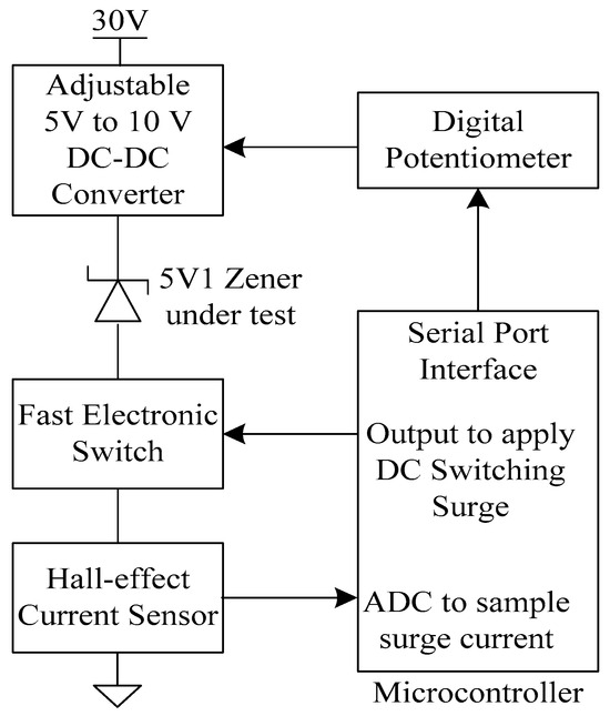 To generate a DC switching surge, the Zener diode under test was connected for a set duration to the output voltage of a DC–DC converter. A digital potentiometer allows for incremental adjustment of the converter’s output voltage, thereby gradually increasing the applied surge voltage level. A fast solid-state electronic switch connected the Zener diode to the selected DC voltage surge level for a programmed duration of 3 ms. A high accuracy Hall-effect current sensor (ACS723) was used to sample the current flowing through the Zener diode ten times during the 3 ms surge event. The ACS723 Hall-effect current sensor device was linear throughout the current measurement range of 10 mA up to 5 A and had a sensitivity of 400 mV/A with an error of ±2%. The measured current samples were then used to calculate the average surge current level experienced by the Zener diode. A block diagram illustrating the DC switching surge current measurement circuit setup is shown in Figure 6.