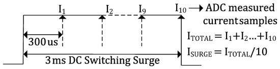 To improve the measurement consistency of the average surge current, the Hall-effect current sensor sampled the current ten times during the 3 ms DC switching surge event at evenly spaced intervals of 300 µs. The average surge current was calculated by summing the ten samples and dividing by ten, as illustrated in Figure 7.