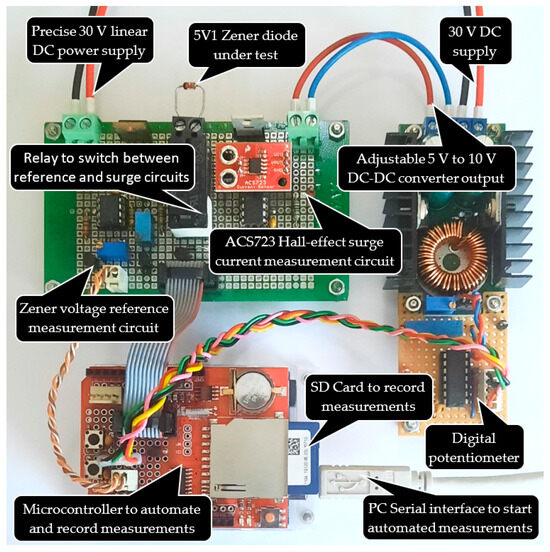 A photograph of the actual constructed experimental test stand setup to investigate the Zener diode reliability against DC switching surges is shown in Figure 8. The test stand setup photo clearly shows a connected 5.1 V Zener diode under test. A precise 30 V linear DC power supply was provided for the Zener voltage reference measurement circuit, and a relay was used to switch the Zener diode between this circuit and the DC switching surge current measurement circuit. An adjustable 5 V to 10 V digital potentiometer that controlled the DC–DC converter output was connected to the DC switching surge current measurement circuit. A high accuracy Hall-effect current sensor (ACS723) was used to measure the average current during the 3 ms DC switching surge events at different adjusted DC–DC converter output voltage levels. The test stand setup operation was automated by the microcontroller code for the measurements of the 80 applied surges. The measurement results were recorded on a secure digital (SD) card. A personal computer (PC) serial interface cable was used the start the automated measurements and to indicate when the test was completed via the PC serial monitor. The SD card was then removed, and the measurement data of the Zener diode under test were saved to the PC for later analysis. The Zener diode was then replaced with the next Zener diode to test, the data cleared, and SD card inserted again.