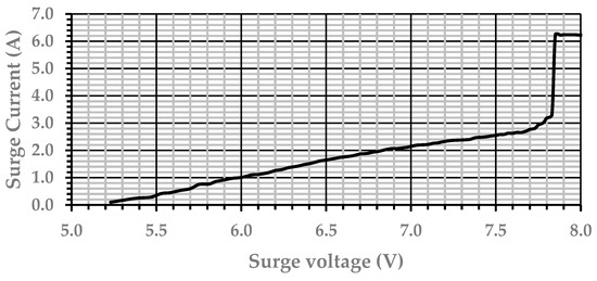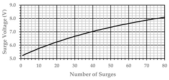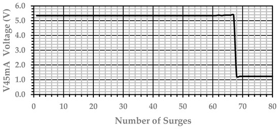 To identify the maximum surge current () level that the Zener diode could withstand before failing to regulate the voltage, a gradually increasing surge voltage () level was utilized during the 80 applied DC switching surges, as graphically shown in Figure 9. This approach allowed for a more precise detection of the just before the Zener diode could no longer maintain the 5.1 V reference voltage level.