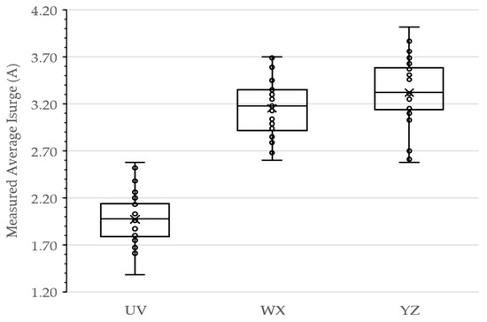 All data values of all three samples were within the expected outlier limits. The boxplots also showed relatively symmetrical distributions, indicating no significant skewness for each sample, since the mean and median were almost equivalent. The average values marked by “X” for WX and YZ were almost similar, suggesting comparable DC switching surge current handling capabilities for these diodes. However, the UV sample displayed a distinct value, which highlights a potential significant variation in surge current handling capability compared to the other two manufacturers. This observation provides a valuable insight where WX and YZ likely offer a consistent performance due to their similar and distribution values, while the UV sample’s difference warrants further investigation.