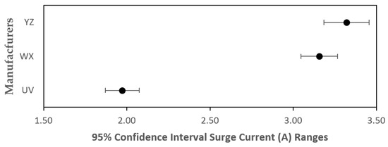 The forest plot shown in Figure 13 utilized the calculated to visually compare the population estimate ranges for the Zener diode UV, WX, and YZ samples degraded by 3 ms DC switching surges. Each range represents the estimated range within which each manufacturer’s true population likely resides with a 95% LOC. This allows for a visual assessment of the potential differences in the population DC switching surge current handling capabilities between the three manufacturers.