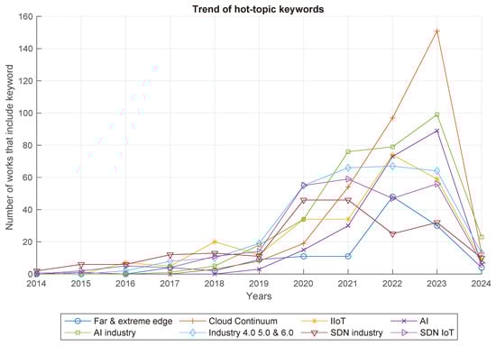 It is crucial to emphasize that this trend only reflects the popularity of certain keywords in research. Consequently, a decrease in the number of keywords may indicate the maturity of certain technologies, which have now been integrated into the industry ecosystem. Consequently, associated research in these areas may decline. For instance, taking the case of SDN, according to Gartner’s projections, the SD-WAN market surpassed $5 billion by the end of 2023, with a market penetration of 60 percent, and anticipates a sustained expansion of the market [,]. Therefore, even though SDN remains a foundational technology, it might not be prominently featured in Figure 1.
