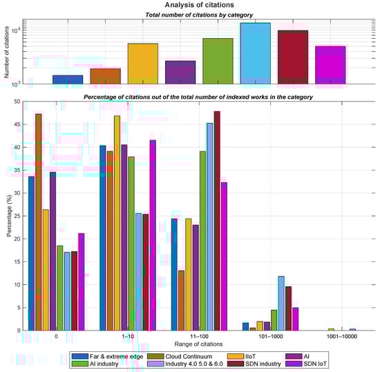 Additionally, we have represented the distribution of citations among these articles in Figure 2. It is divided into two subgraphs representing, from top to bottom, the total number of citations in the category and the distribution of citations in each category. For example, according to Figure 1, Industry 4.0 and beyond has been an established topic since 2020, so there are quite a few papers. This makes it the most cited category, with a total of about 14,000 citations, as the top half of Figure 2 shows. In addition, focusing on the bottom half of Figure 2, 12% of the papers have between 101 and 1000 citations, and 1% have between 1001 and 10,000 citations, so there are relevant papers in this area that are highly cited. Conversely, the field of cloud continuum, despite being the category with the most indexed papers, has garnered fewer citations, possibly due to its significant growth in recent years. This visualization underscores the influence of these publications, particularly highlighting the importance of research in the realm of IIoT.