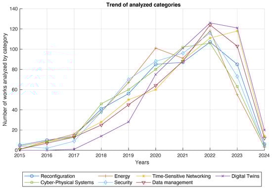 Finally, based on the previous examination, we categorized all works in diverse prevalent topics, namely reconfiguration (which encompasses all works in relation to network management and control flexibility), energy, Time-Sensitive Networking (TSN), DT, Cyber-Physical System (CPS), security, data and information management, whose trends are illustrated in Figure 4 (steadily increasing since 2017, with a small decrease in 2023 and 2024, probably of works still to be published). We organized our survey into these seven categories, with one section dedicated to each of them. Within these sections, we selected the most relevant works from the indexed papers for our analysis (those that covered the three topics: AI, IIoT, and network softwarization), which are the papers analyzed in our survey. In addition, we included two sections on case studies and PhD/MSc theses, bringing the total number of sections to nine. These are described in detail in the following section.