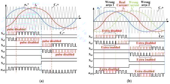 Eliminating redundant states in the modulation depicted in the above figure brings significant advantages. Notably, Sa1 and Sa5, Sa2 and Sa3, and Sa4 and Sa6 will not simultaneously equal ‘1’, essentially preventing the occurrence of current shoot-through. Consequently, the dead time between traditional complementary drive pulses can be eliminated. Moreover, the absence of dead-time effects reduces low-frequency output voltage distortion, while also decreasing the number of switching events, leading to lower switching losses. The PWM shown in Figure 4a exhibits a dead-time-free characteristic, referred to as dead-time elimination. However, traditional dead-time elimination methods heavily rely on accurate current polarity detection. As is evident in Figure 4b, when there is a delay in polarity judgment, polarity errors occur within the regions where the current is greater than 0, resulting in extra forbidden and enabled intervals for Sa1 and Sa3, respectively.