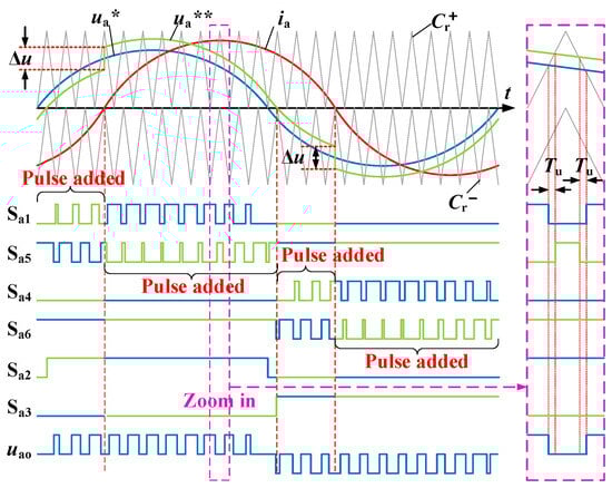 To avoid the dead-time effect, redundant states in the drive pulses can be eliminated based on the polarity of the original modulation wave ua* and current ia. This results in the PWM signals for Sa1 to Sa6 shown in Figure 4a. The fundamental mechanism for generating the drive pulses is similar to traditional carrier-based PWM. Drive pulses are generated by comparing ua* with two in-phase stacked carriers, Cr+ and Cr−. Redundant drive pulses are alternately disabled based on the polarity of the reference current ia and modulation wave ua*. Specifically, Sa1 is disabled when ua* > 0 and ia < 0, Sa5 is disabled when ua* > 0 and ia > 0, Sa4 is disabled when ua* < 0 and ia > 0, and Sa6 is disabled when ua* < 0 and ia < 0.