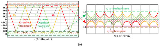 After using this constraint condition, the zero-sequence component limit region used by the midpoint balance control is shown in Figure 11. The overshoot headspace between the three-phase modulated wave ux and the carrier amplitude 1.0 is the overmodulation margin space. When narrow pulse compensation and dead-time elimination are not taken into account, the range of adding zero-sequence components voltage uZ for neutral point balance control corresponds to the shaded area in Figure 11a. However, considering the impact of narrow pulses, subtracting the uZ used for narrow pulse compensation from Figure 11a further results in Figure 11b, which depicts the range of zero-sequence components for neutral point balance control. It can be observed that the compensation area is divided into discontinuous regions, indicating a balance control method that compromises the neutral point balance control capability.