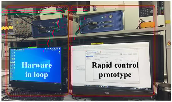 As shown in Figure 12, the semi-physical simulation experimental platform used a MT6016 from a Chinese company ModelingTech (Shanghai, China) [] as the rapid control prototype (RCP) model controller, and another MT6016 as the hardware-in-the-loop (HIL) simulator for the three-level hardware circuit. A hardware connection was established between the two devices for voltage sampling, PWM drive signal transmission, and other necessary functions.
