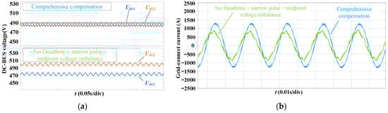 Figure 16a demonstrates the optimization ability of the comprehensive compensation function for the balance of the midpoint potential of the DC bus voltage. The original 10 V voltage difference was eliminated after the compensation control is applied. However, it can be seen from the figure that there was still a slight oscillation in the DC voltage, and further research is needed on this voltage oscillation issue. Figure 16b presents the grid-connected current waveform under open-loop grid-connection conditions with the integrated compensation control proposed in this paper. Before the integration of compensation, due to the modulation index reaching 1.15, the system was at the critical state of over-modulation. Prior to compensation, the output voltage was affected by the dead zone, leading to changes in the grid-connection vector relationship. This resulted in a decrease in the amplitude of the grid-connected current and the generation of a certain amount of reactive current. However, after incorporating integrated compensation, the impact of the dead zone on the inverter output voltage was significantly reduced, enabling the calculation of the active current based on open-loop computation. Additionally, there was a notable improvement in the Total Harmonic Distortion (THD) of the current after the integrated compensation. This demonstrates the effectiveness of the proposed comprehensive compensation strategy.