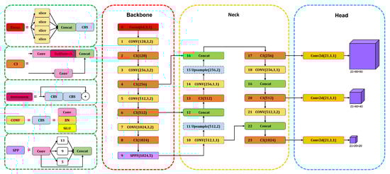 Deep learning algorithms for object recognition are generally divided into two categories: two-stage networks and one-stage networks. Examples of two-stage networks are R-CNN [], Fast R-CNN [], and Faster R-CNN []. They first generate candidate region proposals and then classify these region proposals. This operation greatly improves the accuracy of recognition, but because of this, the computational load of the secondary network is often very large, resulting in poor real-time performance, especially in scenarios where high-resolution images are processed. This shortcoming led to the development and use of single-stage networks, which aimed to simplify the recognition process by eliminating a separate proposal generation step, predicting object classes, and using bounding boxes directly in a single pass of the network, thus significantly speeding up recognition. One-stage networks like YOLO [,,,] and SSD [,,,,] directly predict object categories and locations, reducing some accuracy to speed up processing, making them more suitable for real-time applications. However, SSD uses multiscale feature maps to recognize objects of different sizes, which makes it difficult to see smaller objects on lower-resolution feature maps. In addition, SSD’s method of object recognition, which relies on different layers of feature maps, is not as effective as methods such as the feature pyramid network (FPN) used in subsequent versions of YOLO [], which has led to YOLO entering the mainstream of current single-target recognition algorithms [,,,,].