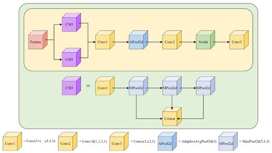 The MSP module is designed based on residual network ideas and multiscale parallelism. The module uses the connections between layers to help information move quickly and efficiently in the network. As shown in Figure 3, the CM3 component of the MSP module contains three pooling layers, each with a different output channel. It can enhance the extraction capabilities of multiscale features while ensuring real-time performance, thereby processing multiscale data features and improving the accuracy of the model. The final adaptive pooling layer helps reduce the loss of input data features, enhances the model’s ability to calculate complex data, and enhances the model’s robustness.