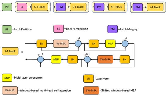 The Swin Transformer module replaces the conventional multihead self-attention (MSA) [] module, which utilizes a ‘window’ (W-MSA)- and ‘shifted window’ (SW-MSA)-based MSA module. This is followed by a two-layer perceptron (MLP) with ReLU [] as the nonlinear function between layers. Layer normalization (LayerNorm) and residual connections are included before and after each MSA module and MLP layer.