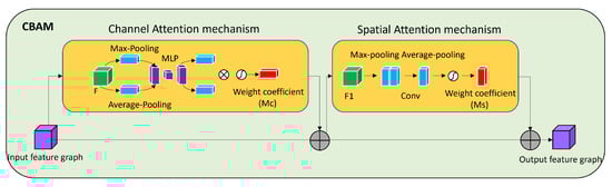 The CBAM module takes the input feature map F with a size of H×W×C and consists of two parts: the channel attention mechanism and the spatial attention mechanism. In the channel attention mechanism, the input feature map F is processed with maximum and average pooling to produce two feature maps of 1 × 1 × C size. These two feature maps are passed through an MLP and a sigmoid activation function to obtain a one-dimensional channel attention map Mc. Multiplying the channel attention map with the original feature map F yields the channel-attention-adjusted feature map F1. In the spatial attention mechanism, the feature map F1 is subjected to maximum and average pooling again, resulting in two feature maps of size H × W × 1. The two feature maps are concatenated and then convolved to generate a two-dimensional spatial attention map Ms. Finally, multiplying the spatial attention map Ms with the feature map F1 yields the output feature map of the CBAM module. This design can simultaneously focus on features in different channels and locations, thus improving the model’s accuracy.