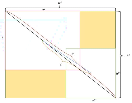 In this formula, represent the final and optimized loss functions, respectively. The additional parameter is introduced to address the issue of sample imbalance. By adjusting , loss contributions from specific samples can be amplified or reduced. This allows to be customized based on sample characteristics, making the loss function target key samples more effectively. After integration with focal loss, the final framework thoroughly addresses the impacts of sample imbalance by considering the loss contributions of challenging samples. The summation in the formula ensures careful consideration of differences in width and height. The use of the exponential function is because, in , as increases, rapidly approaches or exceeds 1, which results in a decrease in the value of the entire expression, thus reducing the contribution of this part of the loss. This design means that when the difference in shape between the predicted box and the initial box is small, the loss increases, thereby encouraging the model to better learn to minimize such discrepancies. Additionally, it allows for a smoother adjustment of the loss function’s sensitivity to shape differences, avoiding excessive perturbation to other aspects. The explanatory diagram for WMD-IOU is illustrated in Figure 8.